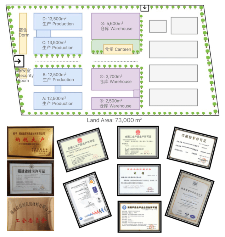 Fujian Yibaili packing material Co. Ltd was established in 2012 with 80 million yuan investment. Its land area is around 73,000 square meters and the total construction area is around 50,000 square meters. The company is located at the Chinese beautiful southern Golden Triangle — Fujian Zhangzhou Changtai (near Xiamen port). The number of current employees is more than 300. Fujian Yibaili is developed based on Xiamen Yibaili Industry and Trade Co., Ltd (founded in 2003), specializing in the production of food packaging materials, paper food containers, plastic packaging containers, and other related products. Our company has passed Quality Standard(QS), ISO9001, British Retail Consortium (BRC), Forests For All Forever (FSC), Supplier Workplace Accountability (SWA), and Good Manufacturing Practice (GMP) check. The company has domestic customers, such as Uni-President, Baixiang Food, Strong, Nissin, Hengan Group, Guming, and foreign customers, such as Mcdonald’s, Costco, Apple, Tesla, Russia, spreading all over Aisa, Europe, Oceania, North and South America.